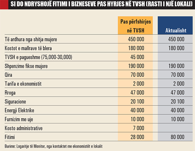 Nëse deri sot (para përfshirjes në skemën e TVSH-së) prej aktivitetit përfitonte një pagë mujore prej 80 mijë lekësh, pas përfshirjes në TVSH, në rastin më të mirë, do t’i mbeten vetëm 35 mijë lekë në muaj. Për më tepër, atij do t’i nevojiten shërbime shtesë, gjë që do t’i rrisë kostot administrative. Sipas ekspertëve, një biznes i vogël do të shpenzojë rreth 7 mijë lekë më shumë çdo muaj për ekonomistë dhe për programet financiare, duke e çuar fitimin neto në 28 mijë lekë në muaj. Me këto nivele fitimi, Besari tha për “Monitor” se nuk ka ndër mend që ta vazhdojë aktivitetin.